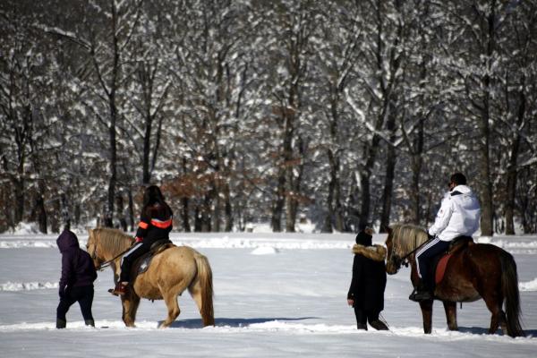 Σε ένα τοπίο που θυμίζει Άλπεις οι επισκέπτες της περιοχής και κυρίως τα παιδιά απολαμβάνουν το χιόνι και το μαγικό τοπίο.