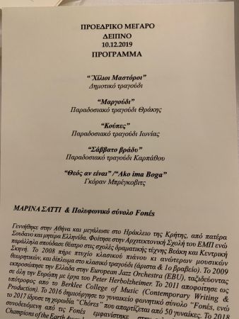 Η έκπληξη ήταν η Μαρίνα Σάττι στο Προεδρικό η οποία τραγούδησε για τους επισήμους προσκεκλημένους. Μαζί της το πολυφωνικό σύνολο fones. Ακούστηκαν τα τραγούδια «χίλιοι μαστοροι», «Μαργούδι», « Κούπες», «Σάββατο βράδυ» και «Θεός αν είναι».