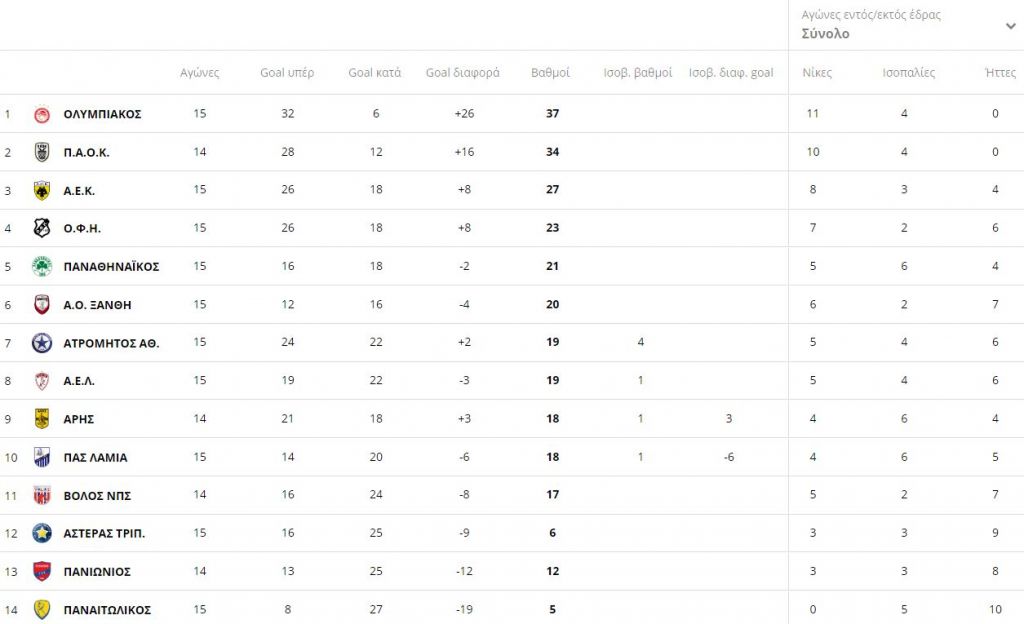Η ομάδα του Πέδρο Μαρτίνς είναι μόνη πρώτη στην κορυφή πλέον με 37 βαθμούς και στο +3 από τον ΠΑΟΚ, ο οποίος βέβαια έχει ένα ματς λιγότερο καθώς αγωνίζεται αύριο (19/12, 19:30) με τον Πανιώνιο στη Νέα Σμύρνη.