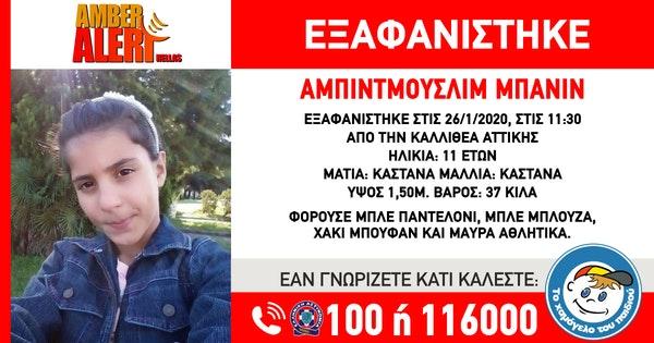 Στις 26/01/2020, στις 11:30, εξαφανίστηκε από την Καλλιθέα Αττικής η Αμπιντμουσλίμ Μπανίν, 11 ετών, με καταγωγή από το Ιράκ. Το «Χαμόγελο του Παιδιού» ενημερώθηκε για την εξαφάνιση της ανήλικης σήμερα, 27.01.2020, πρωινές ώρες και προχώρησε στην ενεργοποίηση του μηχανισμού AMBER ALERT HELLAS.