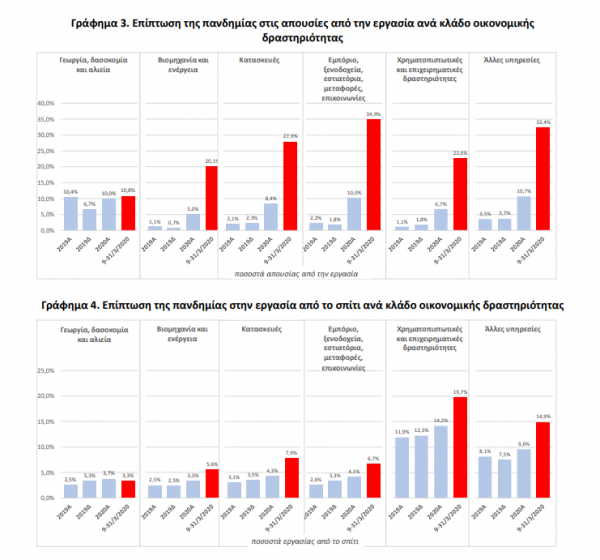 Όσον αφορά στις απουσίες από την εργασία και στη μείωση στις ώρες εργασίας, οι κλάδοι που επηρεάστηκαν περισσότερο ήταν αυτοί των υπηρεσιών (εμπόριο, ξενοδοχεία, εστιατόρια, μεταφορές, επικοινωνίες και άλλες υπηρεσίες), ενώ λιγότερο επηρεάστηκε ο κλάδος της γεωργίας, δασοκομίας και αλιείας.