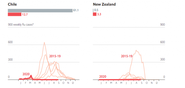 Η μείωση των κρουσμάτων γρίπης εξηγεί και έναν από τους μεγάλους γρίφους των στοιχείων για την πανδημία: Ορισμένες χώρες έχουν βιώσει μικρότερη αύξηση της συνολικής τους θνησιμότητας από ό,τι προκύπτει από τον αριθμό των νεκρών κορωνοϊού. Για παράδειγμα, η Χιλή κατέγραψε 9.800 θανάτους από κορωνοϊό μεταξύ του Ιουνίου και της 25ης Αυγούστου, όμως η συνολική αύξηση των νεκρών κινήθηκε περίπου στους 8.800 σε σχέση με την ίδια περίοδο το 2015-2019. Είναι πιθανό η Χιλή να υπο-καταγράφει τους νεκρούς της, όμως δεν αποκλείεται τα αποτελέσματα να προκύπτουν σε κάποιο βαθμό και από το γεγονός ότι η γρίπη φέτος σχεδόν εξαλείφθηκε.