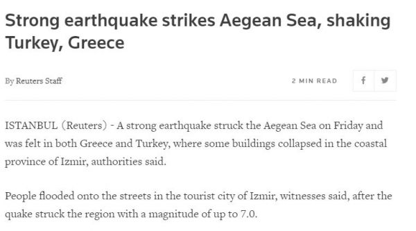 «Δυνατός σεισμός χτυπά το Αιγαίο, “κουνώντας” Τουρκία και Ελλάδα», είναι ο τίτλος του πρακτορείου ειδήσεων Reuters, το οποίο αναφέρει ότι οι κάτοικοι της Σάμου ειδοποιήθηκαν να παραμένουν μακριά από τις παράκτιες περιοχές.