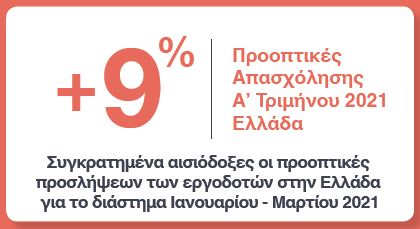 Οι προοπτικές προσλήψεων ενισχύονται κατά 2 ποσοστιαίες μονάδες σε σύγκριση με το προηγούμενο τρίμηνο, αλλά αποδυναμώνονται κατά 16 ποσοστιαίες μονάδες σε σχέση με το αντίστοιχο τρίμηνο του προηγούμενου έτους. Το 39% των Ελλήνων εργοδοτών αναμένει πως θα επιστρέψει στα προ-COVID-19 επίπεδα προσλήψεων εντός των επόμενων 12 μηνών, ενώ παγκόσμια το αντίστοιχο ποσοστό βρίσκεται στο 41%.
