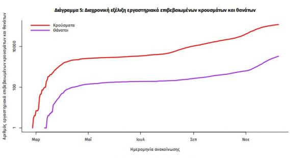Η διαχρονική εξέλιξη των συνολικών κρουσμάτων και συνολικού αριθμού των θανάτων ασθενών COVID-19 παρουσιάζεται στο ακόλουθο διάγραμμα (σε λογαριθμική κλίμακα).