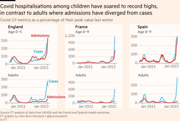 Περίπου 80 παιδιά κάτω των 5 ετών εισάγονται καθημερινά σε νοσοκομείο στην Αγγλία, σε σχέση με το προηγούμενο ρεκόρ των 24 το περασμένο καλοκαίρι. Το ποσοστό νοσηλείας κάτω των 5 ετών στις ΗΠΑ έχει εκτιναχθεί σε πάνω από τέσσερα ανά 100.000 εισαγωγές, από 2,5 ανά 100.000 τον Δεκέμβριο, και είναι μακράν το υψηλότερο ποσοστό κατά τη διάρκεια της πανδημίας.