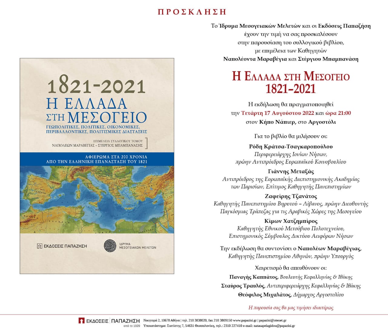 Το Ίδρυμα Μεσογειακών Μελετών και οι Εκδόσεις Παπαζήση παρουσιάζουν το συλλογικό βιβλίο με επιμέλεια των Καθηγητών Ναπολέοντα Μαραβέγα και Στέργιου Μπαμπανάση «1821-2021: Η Ελλάδα στη Μεσόγειο».