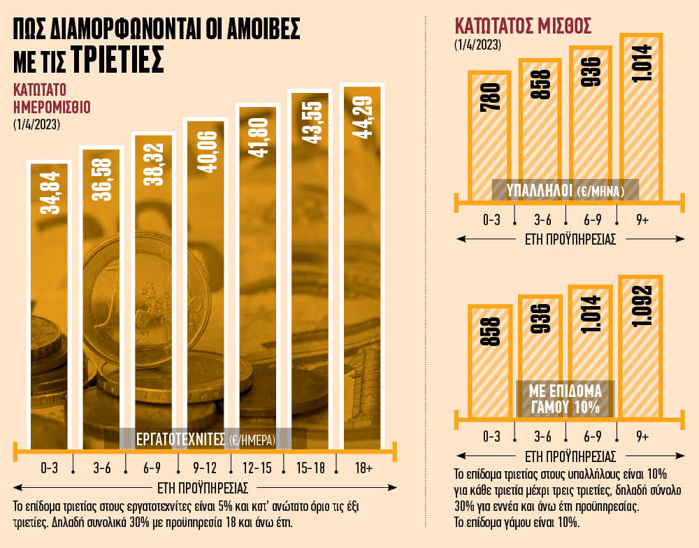 Η μη εξέλιξη των τριετιών δημιουργεί εργαζόμενους πολλών ταχυτήτων ως προς τις αμοιβές τους. Με δεδομένο ότι από την 1η Απριλίου ο νέος κατώτατος μισθός είναι 780 ευρώ, αυτό σημαίνει ότι οι απώλειες είναι 78 ευρώ τον μήνα για όσους έχουν μία τριετία, ανέρχονται στα 156 ευρώ για όσους έχουν δύο τριετίες και φτάνουν στα 234 ευρώ, σε μηνιαία βάση, για όσους έχουν συμπληρώσει τρεις τριετίες.
