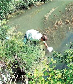 ΑΡ/CLΑUDΕ ΡΑRΙS Υπάλληλος κρατικών υπηρεσιών ελέγχου της ραδιενέργειας συλλέγει δείγματα νερού από τον ποταμό Γκαφιέρ, στην περιοχή Τρικαστέν, όπου σημειώθηκε διαρροή διαλύματος ουρανίου που μόλυνε τον υδροφόρο ορίζοντα