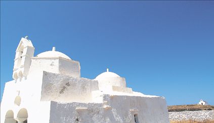 Η Παναγία η Γκρεμιώτισσα Στο πιο θεαματικό σημείο της Χώρας, η Παναγία η Γκρεμιώτισσα είναι το προσκύνημα των απανταχού Ιητών. Χτισμένη επάνω σε απρόσιτο γκρεμό, είναι ένας «σεμνός, γραφικός, χαριτωμένος νησιωτικός ναός», κατοικητήριο της θαυματουργής εικόνας της Κοιμήσεως που ταξίδεψε επάνω σε μικρή σχεδία, με την κανδήλα αναμμένη, από την τουρκοκρατούμενη Κρήτη και έφτασε στα φιλόξενα ακρογιάλια της Ιου. Δίπλα στην εκκλησία ένας ανεμοδαρμένος φοίνικας θυμίζει την παλαιά ονομασία του νησιού, «Φοινίκη». Η Γκρεμιώτισσα εποπτεύει και φυλάει το νησί της από κάθε κακό και βεβαίως πανηγυρίζει τον Δεκαπενταύγουστο με τον χαρακτηριστικό νεανικό παλμό της Νιος: