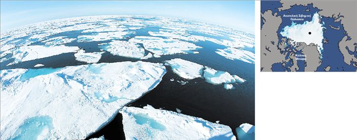 Κατακερματισμένοι ήταν εφέτος το καλοκαίρι οι πάγοι της Αρκτικής (αριστερά), καθώς η αύξηση της θερμοκρασίας έχει επιφέρει πρωτοφανή αλλαγή. Οπως δείχνουν γεωφυσικοί χάρτες (επάνω), οι οποίοι βασίστηκαν σε πρόσφατες φωτογραφίες από δορυφόρους, η κάλυψη από πάγους έχει μειωθεί τόσο ώστε θεωρείται πλέον εφικτός ο διάπλους του Βορείου Πόλου για πρώτη φορά εδώ και 125.000 χρόνια, δηλαδή από την Εποχή των Παγετώνων.