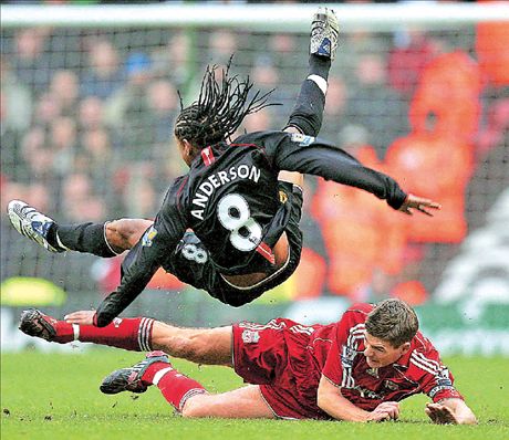 Δεν αποκλείεται τελικά στο σημερινό ντέρμπι με τη Γιουνάιτεντ να μπορέσει να αγωνιστεί και ο λαβωμένος αρχηγός της Λίβερπουλ Στίβεν Τζέραρντ (κάτω), που μαρκάρει τον Βραζιλιάνο Αντερσον στον περυσινό αγώνα των δύο ομάδων