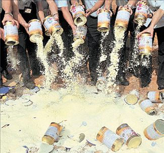 RΕUΤΕRS/SΤRΙΝGΕR (CΗΙΝΑ) Αφού άφησαν για μήνες το σκάνδαλο με το μολυσμένο βρεφικό γάλα να κλιμακώνεται, οι Αρχές της Κίνας τώρα προβαίνουν σε ενέργειες κατευνασμού της λαϊκής αγανάκτησης. Στη φωτογραφία, υπάλληλοι υπηρεσιών ελέγχου στην πόλη Σενζέν αδειάζουν σε σκουπιδότοπο το περιεχόμενο δεκάδων κουτιών με βρεφικό γάλα σε σκόνη, παρουσία καναλιών και φωτογράφων