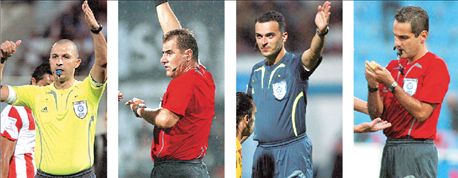 Οι τιμωρηθέντες από την ΚΕΔ (από αριστερά) κκ. Ηλίας Μαζαράκος, Λάζαρος Πολατιάν, Γιάννης Σταυρίδης και Γιώργος Γιαννόπουλος κατέδειξαν με τα λάθη τους το περασμένο Σαββατοκύριακο ότι η ελληνική διαιτησία οδεύει από το κακό στο χειρότερο