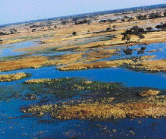 Το τοπίο παρουσιάζει εναλλαγές, λίμνης, λαγκούν, καναλιών. Το νερό είναι σε πολλά σημεία αβαθές και αλλού γίνεται βαθύ ποτάμι, όπου κυλούν ιπποπόταμοι, κροκόδειλοι. Εκεί που νιώθεις το mokoro να αγγίζει τον πάτο, λίγο πιο πέρα τα νερά είναι τόσο βαθιά που βλέπεις τους ιπποπόταμους να μπαινοβγαίνουν στο νερό και φοβάσαι μη σου αναποδυγυρίσουν το βαρκάκι. Καλαμιές και πάπυροι μου κρύβουν τη θέα ενώ ο Rashal όρθιος βλέπει κάποιον κροκόδειλο που λιάζεται και τον πλησιάζει. Τα κανάλια με αβαθή νερά είναι καλυμμένα με μενεξεδένια φύλλα και με λευκά και ροζ νούφαρα. Φοινικόδενδρα, ακακίες, λεύκες, συκιές, έβενοι και άλλα τροπικά δένδρα αντικατοπτρίζονται μέσα στα νερά. Είμαι στην κόψη ενός διπλού πανομοιότυπου κόσμου: ο ένας ο πραγματικός της γης και ο δεύτερος αυτός που μεταφέρεται μέσα στο νερό. Τέλειος αντικατοπτρισμός. Δεν ξέρεις τι να κοιτάξεις. Τα ζώα, τα πουλιά, το νερό, τα νούφαρα, τα δένδρα. Ενας παράδεισος στη γη, ένας γήινος παράδεισος.