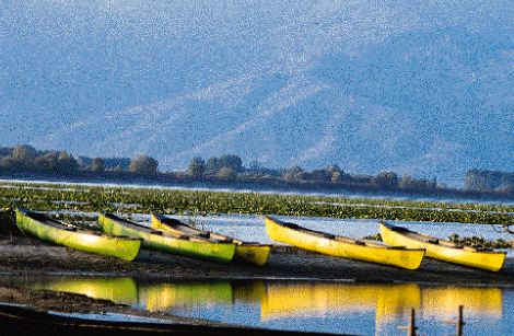 Φοράμε τα πορτοκαλιά σωσίβια και με τα τριθέσια αβύθιστα κανό του «Οικοπεριηγητή» γλιστράμε στη λίμνη. Οι τελευταίες αναλαμπές της δύσης φωτίζουν τις κορυφές του Μπέλες. Κανένας ήχος, μόνο το πλατάγισμα των κουπιών και των φτερών το φουρφούρισμα. Πέντε – έξι ξεκομμένοι πελεκάνοι λάμνουν αργά ανάμεσα στα νούφαρα και χάνονται μες στο μουντό μισοσκόταδο