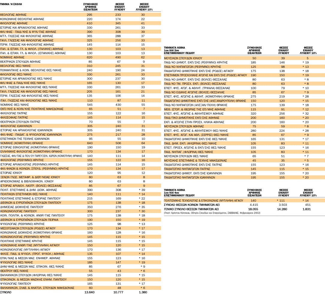 Στο 1ο Επιστημονικό Πεδίο των Ανθρωπιστικών, Νομικών και Κοινωνικών Επιστημών εντάσσονται 95 Τμήματα των Ελληνικών Ανώτατων Εκπαιδευτικών Ιδρυμάτων (ΑΕΙ) που το 2001 προσφέρουν 18.055 θέσεις (εκ των οποίων οι 13.640 αφορούν τα 65 τμήματα που αποκλειστικά ανήκουν στο πρώτο επιστημονικό πεδίο και οι 4.415 τα 30 κοινά τμήματα του 1ου με άλλα επιστημονικά πεδία).