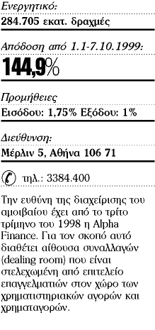 «Οι δυνατότητες του δικτύου των 200 και πλέον καταστημάτων της Alpha Τράπεζας Πίστεως σε όλη την Ελλάδα, η εύκολη πρόσβαση σε όλα τα Alpha αμοιβαία κεφάλαια, η δύναμη των υπό διαχείριση κεφαλαίων που υπερβαίνουν το 1,8 τρισ. δρχ., η σύνεση στη διαχείριση αλλά και η εγγύηση που παρέχει ο όμιλος Alpha Τράπεζας Πίστεως πιστεύουμε ότι αποτελούν τα εχέγγυα για να προτιμηθούν τα αμοιβαία κεφάλαια Alpha».