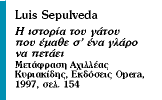 Πριν από δέκα και πλέον χρόνια ο Λουίς Σεπούλβεδα έζησε σε ένα ψαροχώρι στην Ιεράπετρα. Το πρώτο πράγμα που έκανε μόλις έφτασε στην Κρήτη ήταν να επισκεφθεί τον τάφο του Καζαντζάκη όπου έκλαψε από τη συγκίνηση. Ετσι δεν είναι τυχαίο που ο ήρωας του τελευταίου παραμυθιού του λέγεται Ζορμπάς. Τίτλος του βιβλίου που κυκλοφόρησε πέρυσι στα ισπανικά είναι «Η ιστορία του γάτου που έμαθε σ’ ένα γλάρο να πετάει» και ο Ζορμπάς δεν είναι άλλος από τον γάτο «που ήταν μαύρος και πελώριος και χοντρός». Δεν είναι τυχαίο επίσης ότι ο καλός αυτός γάτος, που αναλαμβάνει τη φροντίδα ενός νεογέννητου γλάρου, είναι ένας γάτος από το Αμβούργο. Και τον ίδιο τον Σεπούλβεδα τον είχαν φροντίσει φίλοι του από το Τμήμα της Διεθνούς Αμνηστίας του Αμβούργου το ’77, όταν ήταν έγκλειστος στις φυλακές Τεμούκο της Χιλής, καταδικασμένος σε 28 χρόνια φυλάκισης με την κατηγορία της προδοσίας. Η παραμονή «σε αυτή τη χώρα των πάντων και του κανενός» όπως αναφέρει στο βιβλίο του «Patagonia Express» τελικά διήρκεσε 942 ημέρες. Η Διεθνής Αμνηστία κατάφερε να τον αποφυλακίσει αλλά η εξορία ήταν αναπόφευκτη. Ο «παραμυθάς», όπως χαρακτηρίζει τον εαυτό του ο Λουίς Σεπούλβεδα, ξαναπήγε στην πατρίδα του το ’89, όταν έπεσε η δικτατορία του Πινοσέτ.
