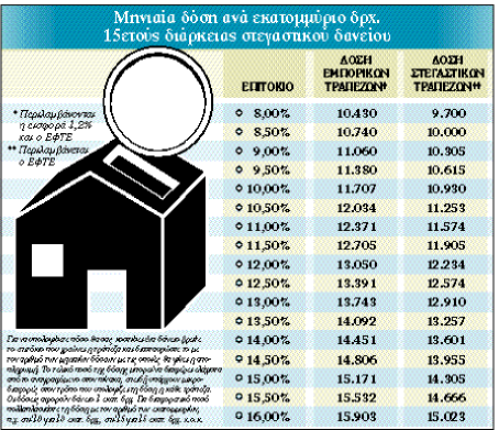 Επίσης, το ύψος του δανείου που μπορείτε να πάρετε σχετίζεται άμεσα με το εισόδημα που δηλώνετε στην Εφορία. Σε γενικές γραμμές, το συνολικό ετήσιο ποσό των δόσεων που καταβάλλετε για την αποπληρωμή του δανείου δεν μπορεί να υπερβαίνει το 40% – 45% του ετήσιου δηλωθέντος εισοδήματος. Ετσι, για εισόδημα 6 εκατ. δρχ. η μηνιαία δόση δεν μπορεί να είναι μεγαλύτερη από 200.000 δρχ., δόση που αντιστοιχεί με τα σημερινά επίπεδα των σταθερών επιτοκίων των στεγαστικών δανείων σε ποσό ύψους 15 εκατ. δραχμών.