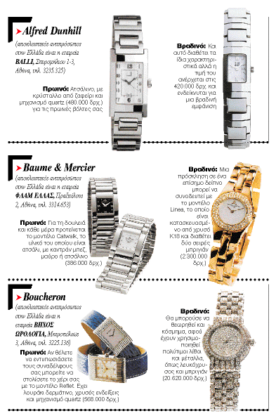 Σύμβολα κυριαρχίας απέναντι στον χρόνο, μοντέλα με ένδοξο παρελθόν και με ξεχωριστή προσωπικότητα είναι οι πιο αντιπροσωπευτικές λέξεις που χαρακτηρίζουν τα ρολόγια που φιλοξενήθηκαν στην έκθεση «Very Important Watches ’99» στο ξενοδοχείο «Μεγάλη Βρεταννία». Ηταν όλοι εκεί. Αντιπροσωπείες γνωστών ρολογιών ανεκτίμητης αξίας τα περισσότερα εξέθεσαν τους μικρούς θησαυρούς τους. Εμείς επισκεφθήκαμε όλα τα περίπτερα, όπου η κάθε εταιρεία πρότεινε δυο γυναικεία ρολόγια, ένα για πρωινές και ένα για βραδινές εμφανίσεις.