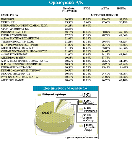 Στο διάστημα Ιανουαρίου-Νοεμβρίου 1998 οι αποδόσεις των ομολογιακών αμοιβαίων αναλύονται ως εξής:
