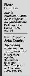 Ο διαπρεπής γάλλος κοινωνιολόγος Pierre Bourdieu, γνωστός ήδη στο ελληνικό κοινό (βλ. λ.χ. στο «Βήμα» της 13ης Οκτωβρίου 1996 «Ο Μπουρντιέ και η Ελλάδα»), που ανακηρύχθηκε πέρυσι διδάκτορας επί τιμή από το Τμήμα Νομικής της Σχολής Νομικών, Πολιτικών και Οικονομικών Επιστημών του Πανεπιστημίου Αθηνών, εγκαινίασε πρόσφατα μια ευρύτερου ενδιαφέροντος σειρά στις Εκδόσεις Liber με τίτλο «Λόγοι για δράση» (Raisons d’ agir). Στη σειρά αυτή ενέταξε τα δύο μαθήματά του στο College de France «Για την τηλεόραση» και «Το δημοσιογραφικό πεδίο και η τηλεόραση» που μεταδόθηκαν από το γαλλικό κανάλι Paris Premiere τον Μάιο του 1996, καθώς και ένα παλαιότερο άρθρο του, «Η καθοριστική επίδραση της δημοσιογραφίας», που δημοσιεύτηκε τον Μάρτιο του 1994 στο περιοδικό που ο ίδιος ίδρυσε και διευθύνει («Actes de la recherche en Sciences Sociales»). Τα τρία αυτά αλληλένδετα μεταξύ τους κείμενα συνθέτουν το ιδιαίτερα διαφωτιστικό και πρωτότυπο βιβλίο του «Για την τηλεόραση και την καθοριστική επίδραση της δημοσιογραφίας» (Sur la television suivi de l’ emprise du journalisme).