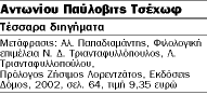 Πρώτος μεταφραστής διηγημάτων του Τσέχωφ στα ελληνικά, απευθείας από τα ρωσικά, ο Αγαθοκλής Γ. Κωνσταντινίδης, από τη Σκύρο, συνομήλικος του Παπαδιαμάντη (γενν. 1854), που παρέμεινε για χρόνια εμπορευόμενος στη Ρωσία, προτού εγκατασταθεί στην Αθήνα, το 1892, ως διερμηνέας της ρωσικής πρεσβείας και αργότερα υποπρόξενος της Ρωσίας στον Πειραιά. Για πρώτη φορά ο Κωνσταντινίδης δημοσίευσε μετάφραση διηγήματος του Τσέχωφ στο περιοδικό «Παναθήναια», Οκτώβριο 1900, και συνέχισε τον Δεκέμβριο του ίδιου χρόνου με τη μετάφραση του διηγήματος «Η θλίψις», τίτλος που παραπέμπει στο διήγημα «Η λύπη», που ο Τσέχωφ πρωτοδημοσίευσε το 1885. Ωστόσο το 1960 η μετάφραση της «Θλίψεως» του Κωνσταντινίδη αναδημοσιεύεται στο αφιέρωμα της «Νέας Εστίας», περιοδικού ευρύτερα προσιτού. Ετσι ανακαλύπτουμε ότι πρόκειται για το διήγημα «Πόνος βαθύς», το τέταρτο του πρόσφατου βιβλιαρίου. Την ίδια εποχή, τρία από τα «Τέσσερα διηγήματα» μεταφράζονται από τη Μ. Αξιώτη, το πιθανότερο εκ του γαλλικού.