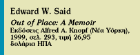 Από τους πλέον γνωστούς διανοητές της μεταπολεμικής περιόδου, ο επιφανής Παλαιστίνιος Edward Said, έπειτα από πολλά βιβλία πάνω στη λογοτεχνία, στην πολιτική σκέψη, στην ιστορία και στη φιλοσοφία, εξέδωσε πρόσφατα το αυτοβιογραφικό βιβλίο του Out of Place: Α Memoir. Οπως λέει ο ίδιος ο συγγραφέας, πρόκειται για «μια καταγραφή ενός χαμένου και ξεχασμένου κόσμου, του κόσμου της παιδικής ηλικίας», μια ειλικρινή προσπάθεια «ανακατασκευής του παρελθόντος» και ταυτόχρονα μια καταγραφή της ζωής ενός ανθρώπου που βίωσε έντονα τον διπολισμό ανάμεσα στη Δύση και στην Ανατολή τόσο ως πολιτική πράξη όσο και ως στάση ζωής και δημιουργίας πολιτισμικής ταυτότητας.
