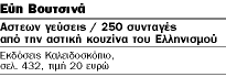Μία συνταγή για κάθε ημέρα σε ένα ιδιότυπο βιβλίο ιστορικής έρευνας με τη μορφή ημερολογίου. H Εύη Βουτσινά είναι γνωστή για τον κοπιαστικό τρόπο με τον οποίο φτιάχνει τα βιβλία της: ταξιδεύει στην επικράτεια, συγκεντρώνει συνταγές, δοκιμάζει υλικά, ανατρέχει σε παλαιότερα κείμενα. Αυτή τη φορά επικεντρώνεται στην αστική κουζίνα παρουσιάζοντας 250 συνταγές από την αστική τάξη. Αναφέρεται στα φαγητά και γλυκά που έτερψαν τους ουρανίσκους των ελλήνων αστών από την Κωνσταντινούπολη, την Αλεξάνδρεια και τις πόλεις της Ανατολικής Ρωμυλίας, ως τη Θεσσαλονίκη, τα Ιωάννινα, τη Βέροια, τα Επτάνησα, την Πελοπόννησο και την Κρήτη. Απλές και πιο πολύπλοκες συνταγές που διευκολύνουν την επιλογή του καθημερινού φαγητού, με την έμφαση να δίνεται στα υλικά που προσφέρει η φύση σε κάθε εποχή.