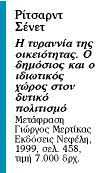 Η ένταξη του ογκώδους βιβλίου του Σένετ Η τυραννία της οικειότητας στην εξαίρετη σειρά Ο νεώτερος ευρωπαϊκός πολιτισμός, που δημιούργησε ο αείμνηστος Παναγιώτης Κονδύλης στις εκδόσεις Νεφέλη, προσφέρει και στον μέσο αναγνώστη και στον ειδικό μελετητή τη δυνατότητα να δει πώς αντιμετωπίζεται ο ευρωπαϊκός πολιτισμός των τριών τελευταίων αιώνων στην άλλη πλευρά του Ατλαντικού και ως έναν βαθμό να κατανοήσει γιατί ο βορειοαμερικανικός πολιτισμός θεωρείται και κατά βάση είναι προβολή και επέκταση της αγγλοσαξονικής Ευρώπης. Ισως, ζώντας κανείς σε κοινωνίες μεταφύτευσης, όπου τα υβριδικά φαινόμενα διαδέχονται αλλεπάλληλα το ένα το άλλο, να μπορεί κάποτε ευκολότερα να κατανοεί τη δυναμική και την εξέλιξη των αλλαγών.