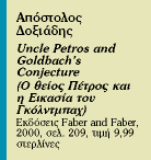 * «Ο θείος Πέτρος και η Εικασία του Γκόλντμπαχ» πρωτοκυκλοφόρησε στα ελληνικά το 1992 από τις εκδόσεις Καστανιώτη. Το βιβλίο θα επανακυκλοφορήσει σύντομα, βασισμένο στο ξαναδουλεμένο αγγλικό κείμενο.