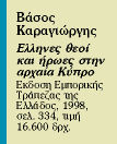 Παρ’ όλο που το βιβλίο του καθηγητή στο Πανεπιστήμιο της Κύπρου κ. Βάσου Καραγιώργη απευθύνεται σε ένα ευρύτερο κοινό και όχι στους ειδικούς επιστήμονες, όπως ο ίδιος επισημαίνει, με τις απαραίτητες γι’ αυτόν τον σκοπό γενικεύσεις και παραλείψεις, και ανεξάρτητα από το αν συμφωνεί κανείς με τις ερμηνείες που προτείνει, εν τούτοις με το βιβλίο του συμβάλλει στην κατανόηση αυτού που είπαμε προηγουμένως: ότι η μυθολογία αποτελεί μία από τις συνιστώσες του πολιτισμού, από την προσέγγιση της οποίας προκύπτουν ιστορικά στοιχεία, που σημαίνει ότι σε κάθε περίπτωση οι μύθοι και η μυθολογία είναι φορείς αλήθειας. Στα ατού του βιβλίου είναι η πλούσια εικονογράφηση, που επιτρέπει στον αναγνώστη να παρακολουθήσει καλύτερα τις τυπολογικές περιγραφές του συγγραφέα και να εκτιμήσει τις ερμηνευτικές προτάσεις του, και βέβαια η βιβλιογραφία.