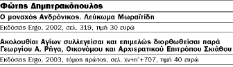Η μεταβυζαντινή λογιοσύνη μέσα από την αγιορείτικη παράδοση έφθασε σε καινούργια ακμή με τις τρεις μεγάλες μορφές των σκιαθιτών συγγραφέων, Παπαδιαμάντη, Μωραϊτίδη και παπα-Γιώργη Ρήγα. Αυτό τουλάχιστον μας δείχνουν δύο νέες εκδόσεις για τον μοναχό Ανδρόνικο και τις Ακολουθίες Αγίων, οι οποίες πραγματοποιήθηκαν με περισσή καλαισθησία από τις εκδόσεις Ergo.
