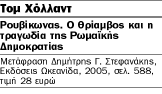 Στα Βαλκάνια, οι αξιωματούχοι της Δημοκρατίας «ικανοποιούσαν τον εγωισμό τους, τρομοκρατώντας ηγεμονίσκους και επαναχαράσσοντας τις γραμμές των συνόρων». Με την περίπτωση του βασιλείου της Μακεδονίας, το οποίο αυθαδίαζε ως κληρονόμος του Μεγάλου Αλεξάνδρου, το 168 π.X. η ρωμαϊκή υπομονή έφτασε στα όριά της. E, να μην περάσουν μετά και στην Ασία απέναντι; «Ηδη, το 190, μια ρωμαϊκή στρατιά είχε σαρώσει την Ασία, είχε κονιορτοποιήσει την πολεμική μηχανή του τοπικού μονάρχη, και τον είχε ταπεινώσει μπροστά στα μάτια όλης της Εγγύς Ανατολής». Στη δε Γαλατία έστειλαν τον Καίσαρα. Εδώ έγινε το μοιραίο λάθος. Αφού κατέλαβε σε λιγότερο από μια δεκαετία οκτακόσιες πόλεις και εξανάγκασε 300 φυλές να παραδοθούν, του ζητήθηκε να υπακούσει στον νόμο και να παραδώσει την ανθυπατεία του στη Ρώμη. E, όχι! «Ανερρίφθη ο κύβος» αναφώνησε το ημιστίχιο του Μενάνδρου διαβαίνοντας τον Ρουβίκωνα ο Καίσαρας. Το είπε στα ελληνικά και ο νοών νοείτω. Με κομμένη την ανάσα παρακολουθούμε από την πρώτη σελίδα ως τον κολοφώνα την εξιστόρηση του Χόλλαντ. Στο τέλος, έχουμε καταλάβει κι εμείς μαζί με τους Ρωμαίους τι έκρυβαν οι προφητείες της Σίβυλλας.