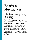 Συγχρόνως κυκλοφορεί στα ελληνικά το βιβλίο του Βαλέριο Μανφρέντι «Οι Ελληνες της Δύσης». Η ιταλική έκδοση (Mondadori, 1996) ήταν το επιστέγασμα της ομώνυμης έκθεσης στο Παλάτσο Γκράσι της Βενετίας, μιας έκθεσης που έγινε δεκτή «με τις συνήθεις τυμπανοκρουσίες για να ακολουθήσει ο συριγμός της πολεμικής κριτικής», όπως έγραψε τότε το «Panorama» (4/4/1996). Γεγονός παραμένει ότι η Ιταλία είδε στη διάρκεια των τελευταίων δύο χρόνων να εκδίδονται μνημειώδη έργα για τον αρχαίο ελληνικό πολιτισμό, όπως την ολοκλήρωση σε πέντε τόμους του «Spazio letterario della Grecia antica» από τις εκδόσεις Salerno και τις δύο εφάμιλλες εκδόσεις του Einaudi, το «Ι Greci. Storia, arte, cultura, societa» και το «Civilta letteraria dei greci». «Εργα που διευρύνουν τα πολιτισμικά, γεωγραφικά αλλά και χρονολογικά όρια του ελληνισμού» σχολίαζε το «Panorama», επισημαίνοντας συγχρόνως τη νέα προβληματική που αναδύεται μέσα από την αναζωπύρωση του ενδιαφέροντος για τον αρχαιοελληνικό πολιτισμό ­ κατά σύμπτωση; ­ στο γύρισμα της χιλιετίας.