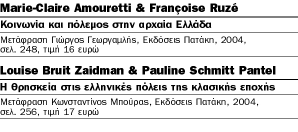 Στο Κοινωνία και πόλεμος στην αρχαία Ελλάδα (οι συγγραφείς του οποίου περιορίζονται στην κλασική εποχή, κάτι που δεν επισημαίνεται στον ελληνικό τίτλο του βιβλίου) εξετάζεται η σχέση των αρχαιοελληνικών κοινωνιών με τον πόλεμο και η επίδραση του πολέμου επάνω σε αυτές. Κατά την κλασική περίοδο ο πόλεμος ήταν κάτι παραπάνω από συνηθισμένος: οι αρχαίες πόλεις-κράτη – όταν δεν ήταν απασχολημένες με την απόκρουση «βαρβάρων» εισβολέων και την υπόταξη των τοπικών μη ελληνικών φύλων που κατοικούσαν στην επικράτεια των διαφόρων αποικιών – συγκρούονταν συνεχώς μεταξύ τους. Εδώ η προσέγγιση είναι, θα λέγαμε, αντι-ηρωική. Δεν θα βρούμε αναλυτικές περιγραφές και συζητήσεις σχετικά με τον οπλισμό, τις τακτικές στο πεδίο της μάχης, την ψυχολογία του οπλίτη ή του κωπηλάτη, εκτενείς περιγραφές αρχαίων μαχών και άλλα παρόμοια θέματα που ενδεχομένως να ερεθίζουν αμεσότερα τη φαντασία του ερασιτέχνη αναγνώστη. Τις Amouretti και Ruzé ενδιαφέρει περισσότερο να διερευνήσουν την αμφίδρομη σχέση που αναπτύσσεται ανάμεσα στον τρόπο διεξαγωγής του πολέμου και στις ποικίλες μορφές κοινωνικής οργάνωσης. Παρέχεται λοιπόν πλήθος πληροφοριών για τις λιγότερο «glamorous» πλευρές του απεχθούς αυτού φαινομένου. Εξετάζονται ζητήματα όπως η στρατολόγηση, η εκπαίδευση και ο τρόπος δράσης των διαφόρων στρατιωτικών σωμάτων, η διάρκεια και η φύση των εκστρατειών και ο τρόπος χρηματοδότησής τους, η σχέση της στρατιωτικής και της πολιτικής εξουσίας, οι επιπτώσεις του πολέμου στον άμαχο πληθυσμό και στη διεξαγωγή των οικονομικών δραστηριοτήτων. Τα επί μέρους ζητήματα αναλύονται με όλες τις λεπτομέρειες που ο σχετικά περιορισμένος χώρος επιτρέπει, ενώ παρατίθενται αρκετά αποσπάσματα αρχαίων κειμένων. Δυστυχώς η μετάφραση δεν βοηθά το μάλλον τεχνικό, επιστημονικό ύφος του συγγράμματος. Αρκετές είναι οι λανθασμένες επιλογές σε επίπεδο συνεκφοράς λέξεων (collocation) που οδηγούν στη δημιουργία ακατανόητων ή ανοίκειων φράσεων, οι οποίες διακόπτουν τη ροή της ανάγνωσης και δυσκολεύουν την πρόσληψη των νοημάτων. Παραθέτουμε λίγα παραδείγματα: «χώρα ευμενή ωστόσο στην εκτροφή αλόγων… ορμούν κάνοντας ρήγμα» (σελ. 59), «επιγραφή με καταγωγή τη Σπάρτη» (σελ. 112-3), «αναφέρονται στην κόπωση των πολιτών απέναντι στον πόλεμο» (σελ. 222). Παραδόξως το έργο του Θουκυδίδη συγκαταλέγεται στις λογοτεχνικές πηγές (σελ. 103), ενώ δεν λείπουν και λάθη στις χρονολογίες: ο Πολέμαρχος, αδελφός του Λυσία, δεν δολοφονήθηκε το 495 (σελ. 124) αλλά το 404, ενώ οι ολιγαρχικοί δεν κατέλαβαν την εξουσία στην Αθήνα το 441 (σελ. 199) αλλά το 411.
