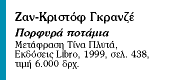 Ο Ζαν-Κριστόφ Γκρανζέ (γενν. το 1961) ζει στο Παρίσι και είναι ανεξάρτητος ρεπόρτερ με δικό του πρακτορείο Τύπου. Εχει συνεργαστεί με πολλά πρακτορεία κι έχει δημοσιεύσει ρεπορτάζ στο «Paris-Match», στο «Figaro Magazine» και σε περιοδικά της Ευρώπης και της Ιαπωνίας. Το πρώτο του μυθιστόρημα υπό τον τίτλο Le vol des cigognes το εμπνεύστηκε από την αποδημία των πελαργών, όπως την καταγράφουν οι τεχνητοί δορυφόροι πρόκειται να γίνει τηλεοπτική σειρά, ενώ τα Πορφυρά ποτάμια, που κυκλοφόρησαν το 1998, προορίζονται για τον κινηματογράφο.