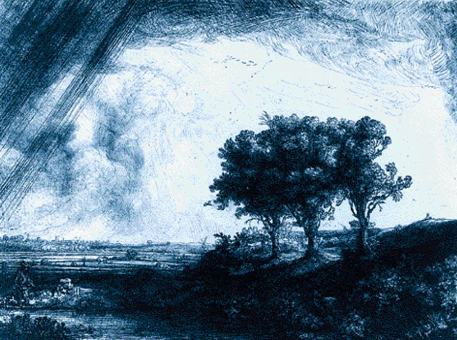 Γράφεται μερικές φορές ότι αυτό που είναι πάνω από όλα ελκυστικό στα χαρακτικά του Ρέμπραντ είναι το ότι μοιάζουν αβίαστα σαν σκίτσα. Παρ’ ότι κάτι τέτοιο ισχύει για ορισμένα, σε καμία περίπτωση δεν ισχύει για όλα ή για τα καλύτερα. Πράγματι τα χαρακτικά του – όπως και τα σχέδιά του και οι πίνακές του άλλωστε – ενίοτε επιδεικνύουν την εκχειλίζουσα ευχέρειά του. Ωστόσο τα πιο εξαίρετα ανάμεσά τους δεν είναι καθόλου ανάλαφρα αλλά είναι βαριά και βαθιά, χτισμένα με μεγάλους, πλατείς όγκους, με γενικές τονικές σχέσεις που συγκεντρώνονται σε δύο ή τρία μεγάλα τμήματα του έργου. Και ίσως η μεγαλύτερη ομορφιά τους είναι σε αυτές τις παχύρρευστες σκιές, τις τόσο πυκνές και συμπαγείς, που ωστόσο δεν είναι ποτέ ολόμαυρες αλλά μέσα από κάθε ολόψυχη χαρακιά της βελόνας αφήνουν πάντα να περνά λίγο, ελάχιστο φως.