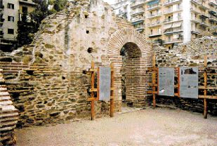 Το ανακτορικό συγκρότημα που ανήγειρε ο Γαλέριος στη Θεσσαλονίκη στις αρχές του 4ου αιώνα μ.Χ. καταλάμβανε έκταση 150 στρεμμάτων περίπου και εκτεινόταν από τη Ροτόντα ως τη θάλασσα και από το ανατολικό τείχος της πόλης ως την περιοχή μεταξύ της σημερινής πλατείας Ναυαρίνου και της Αγίας Σοφίας. Η εγκατάσταση του Γαλερίου στην πόλη επιβεβαιώνεται από την έναρξη λειτουργίας αυτοκρατορικού νομισματοκοπείου, ενώ τη μεγάλη του νίκη επί των Περσών, από την οποία επέστρεψε νικητής στη Βαλκανική και ήταν εν μέρει υπεύθυνη για την άνοδό του στα ανώτατα αξιώματα, επιβεβαιώνουν οι ανάγλυφες παραστάσεις της θριαμβικής αψίδας που σώζεται στην πόλη. Η ανασκαφική έρευνα, η οποία διενεργήθηκε κατά τις δεκαετίες του ’50 και του ’60 όταν ο δήμος αποφάσισε τη διαμόρφωση της πλατείας, έφερε στο φως το νοτιοανατολικό τμήμα του ανακτόρου. Συγκεκριμένα ένα κεντρικό περιστύλιο αίθριο, περιβαλλόμενο κατά τις τρεις πλευρές του από δωμάτια αλλά και από διαδρόμους με ψηφιδωτά δάπεδα. Στη νότια και δυτική στοά του περιστυλίου μάλιστα ύστερα από έναν καταστρεπτικό σεισμό του 5ου αιώνα κατασκευάστηκαν δάπεδα με μαρμάρινες πλάκες και χονδροψηφιδωτό. Ενα διώροφο καμαροσκεπές κτίσμα αποκαλύφθηκε εξάλλου ανάμεσα στο μικρό περιστύλιο και στον ιππόδρομο, καθώς και μνημειακή Βασιλική, μια αίθουσα για τις επίσημες ακροάσεις. Στο νοτιοανατολικό τμήμα υπάρχουν τα Λουτρά, όπως αποδεικνύει η καμαροσκέπαστη δεξαμενή, και ένας μεγάλος αριθμός αγωγών διαφόρων τύπων, διαστάσεων και κατευθύνσεων. Ιδιαίτερο ενδιαφέρον ωστόσο παρουσιάζει το Οκτάγωνο, το οποίο αποκαλύφθηκε το 1950 από τον αρχαιολόγο Χ. Μακαρόνα. Πρόκειται για μια περίκεντρη αίθουσα με οκταγωνική κάτοψη και με λαμπρή εσωτερική διακόσμηση, αλλά με χρήση κατά την αρχαιότητα, άγνωστη σήμερα, παρ’ ότι εικάζεται ότι μπορεί να λειτουργούσε ως αίθουσα θρόνου ή ναός. Το βέβαιο όμως είναι ότι ο προθάλαμος του Οκταγώνου επικοινωνούσε μέσω ενός πρόπυλου και ενός δεύτερου μεγάλου περιστυλίου με τη θάλασσα. Τέλος, όπως έχει αποδειχθεί από την ανασκαφική έρευνα, σε όλη την έκταση του αρχαιολογικού χώρου υπάρχουν και πρωιμότερες φάσεις του ανακτόρου με τοιχογραφίες και ψηφιδωτά.