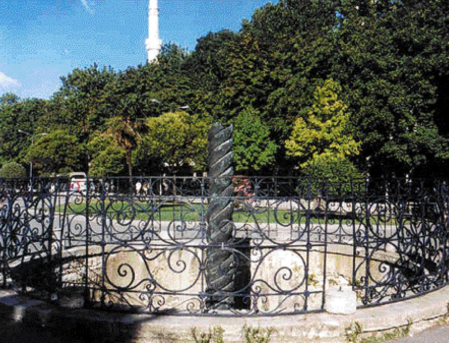Εμεινε λοιπόν στη θέση του για αιώνες γυμνό το τρικέφαλο φίδι που στήριζε τον χρυσό τρίποδα. Το ύψος του 6 μέτρα. Ωσπου, σύμφωνα με την παράδοση, ο Μέγας Κωνσταντίνος το απέσπασε από τον δελφικό θεό και το μετέφερε στην Κωνσταντινούπολη, ως συμβολικό μεν, πανίσχυρο δε, θεμέλιο για τη νέα του πόλη. Ο περήφανος χάλκινος «τρικάρηνος όφις» στήθηκε στο μέσον του ιπποδρόμου, εκεί που αργότερα (το 532 μ.X.) ξέσπασε η Στάση του «Νίκα». Εκεί λοιπόν που το άφησε ο Μέγας Κωνσταντίνος βρίσκεται και σήμερα το χάλκινο φίδι. Ο ιππόδρομος δεν διατηρείται βέβαια στην αρχική του μορφή, όμως μερικά από τα μνημεία που τον κοσμούσαν παραμένουν στην πλατεία Σουλτάν Αχμέτ. Ο «τρικάρηνος όφις» στέκει όρθιος αλλά ακέφαλος, φυλακισμένος αλλά και περιβαλλόμενος από κιγκλίδωμα. Κάθε ημέρα όμως που περνάει φθείρεται όλο και περισσότερο το χάλκινο υπέργηρο σώμα του. Πόσο ακόμη άραγε θα αντέξει; Και ποιος θα βρεθεί, μετά από τόσους αιώνες έκθεσης στις καιρικές συνθήκες, να τον προφυλάξει ώστε να σωθεί ό,τι έχει απομείνει από το περήφανο αυτό μνημείο; Ας σημειωθεί ότι τα τρία κεφάλια του είχαν ήδη αποκοπεί από τον κορμό τους από το 1700. Ενα από αυτά βρίσκεται στο Μουσείο της Κωνσταντινούπολης.