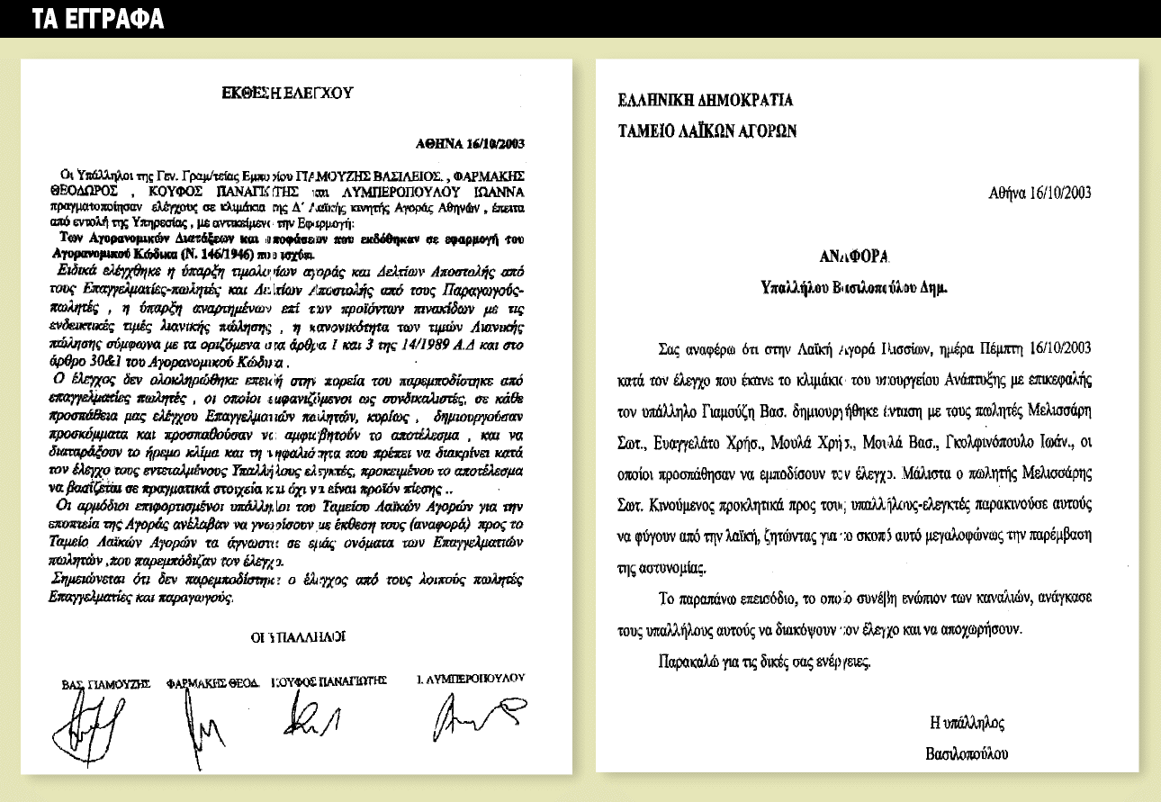 Είναι αποκαλυπτική η έκθεση ελέγχου που συνέταξαν την περασμένη Πέμπτη οι υπάλληλοι της Γενικής Γραμματείας Εμπορίου του υπουργείου Ανάπτυξης κκ. B. Γιαμούζης, Θ. Φαρμάκης, Π. Κουφός και η κυρία Ιωάννα Λυμπεροπούλου, οι οποίοι είχαν αποσταλεί για να πραγματοποιήσουν τον σχετικό έλεγχο στη Δ’ Λαϊκή Αγορά της Αθήνας, που βρίσκεται στην περιοχή των Ιλισίων, προκειμένου να διαπιστώσουν αν υλοποιούνται οι αγορανομικές διατάξεις και αποφάσεις που εκδόθηκαν σε εφαρμογή του αγορανομικού κώδικα (N. 146/1946) που ισχύει: «Ελέγχθηκε η ύπαρξη τιμολογίων αγοράς και δελτίων αποστολής από τους επαγγελματίες πωλητές και δελτίων αποστολής από τους παραγωγούς-πωλητές, η ύπαρξη αναρτημένων επί των προϊόντων πινακίδων με τις ενδεικτικές τιμές λιανικής πώλησης, η κανονικότητα των τιμών λιανικής πώλησης σύμφωνα με τα οριζόμενα στα άρθρα 1 και 3 τής 14/1989 ΑΔ και στο άρθρο 30&1 του αγορανομικού κώδικα. Ο έλεγχος δεν ολοκληρώθηκε επειδή στην πορεία του παρεμποδίστηκε από επαγγελματίες πωλητές οι οποίοι, εμφανιζόμενοι ως συνδικαλιστές, σε κάθε προσπάθειά μας ελέγχου επαγγελματιών πωλητών κυρίως δημιουργούσαν προσκόμματα και προσπαθούσαν να αμφισβητούν το αποτέλεσμα και να διαταράξουν το ήρεμο κλίμα και τη νηφαλιότητα που πρέπει να διακρίνει κατά τον έλεγχο τους εντεταλμένους υπαλλήλους ελεγκτές προκειμένου το αποτέλεσμα να βασίζεται σε πραγματικά στοιχεία και όχι να είναι προϊόν πίεσης. Οι αρμόδιοι επιφορτισμένοι υπάλληλοι του Ταμείου Λαϊκών Αγορών για την εποπτεία της αγοράς ανέλαβαν να γνωρίσουν με έκθεσή τους (αναφορά) προς το Ταμείο Λαϊκών Αγορών τα άγνωστα σε εμάς ονόματα των επαγγελματιών πωλητών που παρεμπόδιζαν τον έλεγχο. Σημειώνεται ότι δεν παρεμποδίστηκε ο έλεγχος από τους λοιπούς πωλητές, επαγγελματίες και παραγωγούς».