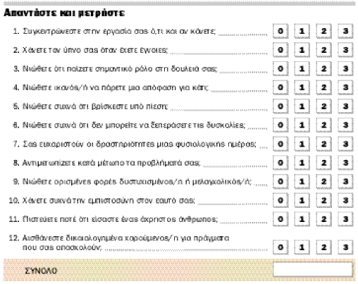 Η ικανοποίηση των εργαζομένων από τις συνθήκες εργασίας τους είναι από τους πιο καθοριστικούς παράγοντες απόδοσης και παραγωγικότητας. Το Τμήμα Οικονομικών του Πανεπιστημίου Warwick της Βρετανίας πραγματοποίησε πρόσφατα έρευνα για να εξακριβώσει κατά πόσο οι εργαζόμενοι είναι ικανοποιημένοι από τη δουλειά τους, πόσο άγχος έχουν και κατά πόσο τα συναισθήματα που δημιουργούνται λόγω της επαγγελματικής σταδιοδρομίας τους επηρεάζουν την προσωπική τους ζωή. Το ερωτηματολόγιο, το οποίο μπορείτε και εσείς να αξιοποιήσετε, αποτελείται από 12 ερωτήσεις και σας βοηθάει να ελέγξετε αν η εργασία σάς δημιουργεί άγχος και πόσο σας επηρεάζει. Η κάθε ερώτηση πρέπει να απαντηθεί σύμφωνα με μια κλίμακα από το 0 ως το 3, επιλέγοντας το 0 για την απόλυτη ικανοποίηση και το 3 για το χαμηλότερο επίπεδο ικανοποίησης. Αν το σύνολο των βαθμών που θα συγκεντρώσετε είναι μεταξύ 10 και 12, σημαίνει ότι οι συνθήκες εργασίας δεν σας δημιουργούν πρόβλημα. Να ανησυχείτε αν οι βαθμοί είναι πάνω από 20.
