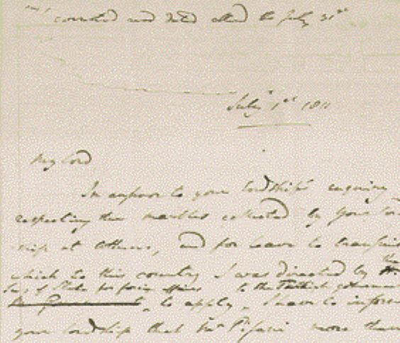 «Με τη λήψη του ιδιαιτέρου σας μηνύματος σχετικά με τις αρχαιότητες που συγκέντρωσε ο λόρδος Ελγιν στην Ανατολή δεν παρέλειψα να επαναλάβω το αίτημα που είχα ήδη υποβάλει ιδιωτικώς στην οθωμανική κυβέρνηση για παροχή αδείας προκειμένου αυτές να φορτωθούν (σε πλοίο) στην Αθήνα. Επειδή οι προκαταρκτικές ενέργειες με στόχο τη φόρτωσή τους δεν πραγματοποιήθηκαν με την έγκριση ενός φιρμανιού, έχω συναντήσει μεγάλη δυσκολία στο να προωθήσω τις επιθυμίες της Εξοχότητάς του και ακόμα και τώρα είναι πολύ αμφίβολο κατά πόσον ο στόχος θα μπορούσε να επιτευχθεί το ίδιο σίγουρα με ένα φιρμάνι όσο με την υποβολή ιδιωτικού αιτήματος στον Βοεβόδα των Αθηνών».