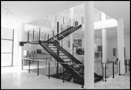 Κεντρικό στοιχείο της σύνθεσης αποτελεί το κλιμακοστάσιο, με την παρουσία της «μνημειακού» χαρακτήρα κλίμακας, η οποία είναι από ατσάλινους βραχίονες και γυάλινα σκαλοπάτια, τα οποία με τη σειρά τους τής προσδίδουν διαφάνεια και επιτρέπουν την απρόσκοπτη θέαση των εκθεμάτων. Εκτός της προφανούς χρήσης της, ως μέσου μετάβασης στα διαφορετικά επίπεδα, η κατασκευή αυτή αποτελεί από μόνη της ένα αξιόλογο «έκθεμα», ένα είδος κονστρουκτιβιστικού γλυπτού που σχεδόν για χάρη του και μόνο θα άξιζε να επισκεφθεί κανείς το Μουσείο. Το «πλαστικό» αυτό κλιμακοστάσιο δεσπόζει του χώρου χαρακτηρίζοντάς τον, φωτίζεται από μια γυάλινη πυραμιδοειδή στέγη (skylight) που ρίχνει άπλετο και διάχυτο φυσικό φως στα εκθέματα και δεν θα δίσταζα να το αποκαλέσω μια μεγάλης συνθετικής αξίας κατακόρυφη lichthof, η οποία θα μπορούσε να αποτελέσει το «σήμα κατατεθέν» του νέου εκθεσιακού χώρου. Τόσο τα υαλοστάσια όσο και τα πλαϊνά υαλοπετάσματα είναι τριπλής διατομής, αποτελούμενα εσωτερικά από οπλισμένο και εξωτερικά από διπλό θερμομονωτικό, υψηλής ηλιακής απορροφητικότητας γυαλί.