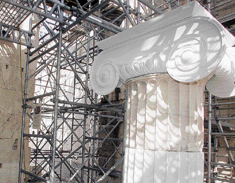 Μια τέτοια στιγμή ήρθε τον περασμένο μήνα με την ολοκλήρωση και έκθεση του ιωνικού κιονόκρανου των Προπυλαίων από την ομάδα τού επί πάνω από είκοσι χρόνια αναστηλωτή των Προπυλαίων, αρχιτέκτονα Τάσου Τανούλα. Διεθνώς καταξιωμένος, ο Τανούλας έχει πίσω του ένα πολύ σημαντικό ερευνητικό και αναστηλωτικό έργο πάνω στην αρχιτεκτονική της κλασικής αρχαιότητας. Πριν από χρόνια η Αρχαιολογική Εταιρεία εξέδωσε τη διδακτορική του διατριβή για τις μεσαιωνικές φάσεις των Προπυλαίων, ένα μνημειώδες έργο – σημείο αναφοράς έκτοτε της διεθνούς βιβλιογραφίας για την ιστορία της αθηναϊκής Ακρόπολης, ενώ μεταγενέστερα δημοσιεύματα και διαλέξεις του σε αμερικανικά και ευρωπαϊκά πανεπιστήμια αφήνουν εξαιρετικές εντυπώσεις. Ενδειξη του κύρους που απολαύει μεταξύ των ομοτέχνων του είναι το ότι ήταν ο ομιλητής στη Διάλεξη Ράνσιμαν του King’s College στο Λονδίνο τον Νοέμβριο του 2004 με θέμα την «Ιστορία και αναστήλωση των Προπυλαίων». Με βάση τη μελέτη αποκατάστασης που ο ίδιος εκπόνησε, και κάτω από τη διαρκή επίβλεψή του, δούλεψαν οι καλλιτέχνες του μαρμάρου, οι Τηνιακοί Γιώργος Δεσύπρης και Αριστείδης Κλάδιος, με βοηθούς τους τον Ιάκωβο Κλάδιο και τον Ροβέρτο Βιδάλη. Δύο χρόνια χρειάστηκαν για να φιλοτεχνηθεί το ακριβές αυτό αντίγραφο που ανήκει στη δυτική αίθουσα του μνημείου και θα τοποθετηθεί στη θέση του σε δύο περίπου μήνες, αφού προηγουμένως προσφέρει από πολύ κοντά (in situ θα απέχει δέκα μέτρα από το έδαφος) την απόλαυση της αριστοτεχνίας του στους επισκέπτες των Προπυλαίων. Στο μεταξύ παρουσιάζεται, πολύ πιο κοντά στον θεατή, πάνω σε τρεις μόνον σπονδύλους.