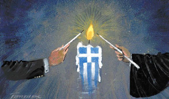 Το κενό δε αυτό ακριβώς επιχειρεί να καλύψει ορμητικά η αυτόκλητα προφητολογούσα Εκκλησία της Ελλάδος. Τα πρακτικά και ιδεολογικά διλήμματα της Πολιτείας ερμηνεύονται και σημασιολογούνται ως συμπτώματα που τεκμηριώνουν μια περαιτέρω «δομική» σχάση ανάμεσα στο Κράτος και στην Κοινωνία. Η δεύτερη, ως πηγή αιώνιων αξιών, εκφράζεται με το όνομα του έθνους και της παράδοσης που εγκαλούνται να ορθώσουν το ανάστημά τους απέναντι στον δημοκρατικό ορθολογισμό των κατεστημένων έννομων εξουσιών. Και έτσι ο κλασικός φιλελεύθερος χωρισμός Κράτους και Κοινωνίας, δηλαδή της πολιτικής και της ιδιωτικής σφαίρας, μετασημασιολογείται σε έναν ιδεολογικό χωρισμό της λειτουργίας των πολιτών ως φορέων ορθολογισμού και ως φορέων αιώνιων αξιών και παραδόσεων.
