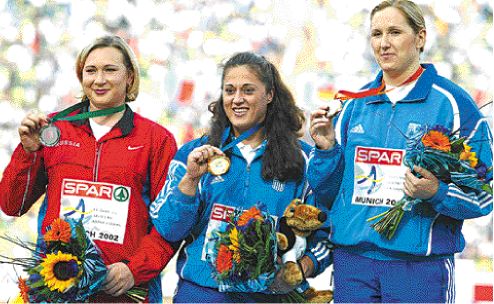 Συλλογή μεταλλίων κάνει η Μιρέλα Μανιάνι, η οποία το 1998 στο Ευρωπαϊκό Πρωτάθλημα της Βουδαπέστης ήταν μόλις 9η. Τον επόμενο χρόνο στη Σεβίλλη όμως αναδείχθηκε παγκόσμια πρωταθλήτρια. Το 2000 στο Σίδνεϊ πήρε το ασημένιο, όπως και πέρυσι στο Παγκόσμιο του Εντμοντον. Η νίκη στο Μόναχο ήταν εύκολη υπόθεση, έστω και αν εφέτος η Μιρέλα είχε ελάχιστους αγώνες. «Εμείς ετοιμαζόμαστε για τους αγώνες που μας θέλει η χώρα μας. Τα μίτινγκ δεν μας ενδιαφέρουν. Εξάλλου η Μιρέλα είναι ντελικάτο κορίτσι και πρέπει να την προστατεύω από τραυματισμούς» τόνισε ο προπονητής της κ. Βασίλης Κοκόλης, ο «δάσκαλος» του αγωνίσματος, αφού από τα χέρια του πέρασαν και η Βερούλη και η Σακοράφα. Η Μανιάνι, που χώρισε πέρυσι με τον αρσιβαρίστα Γιώργο Τζελίλη, με τον οποίο είχαν γνωριστεί το 1996, όταν αγωνίζονταν με την ομάδα της Αλβανίας στην Ατλάντα, και είχαν παντρευτεί τον επόμενο χρόνο, κέρδισε το χρυσό με την καλύτερη επίδοση εφέτος στον κόσμο (67,47 μ.). Πριν από τους αγώνες είχε ρίξει 63,04 μ. και ήταν 10η στον παγκόσμιο πίνακα. «Αν χρειαζόταν θα έριχνα και παραπάνω. Το ήθελα πολύ αυτό το χρυσό. Ημουν σε καλή κατάσταση όταν έφθασα στο Μόναχο, αλλά φοβήθηκα λίγο τον καιρό γιατί με τη βροχή και το κρύο του προκριματικού κρύωσα. Ευτυχώς όμως που όλα πήγαν καλά» δήλωσε από τη βαυαρική πρωτεύουσα.