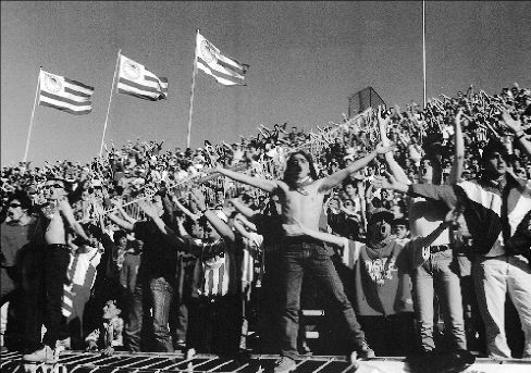 «Επίσης, το σύνθημα που έχουν λανσάρει και φωνάζουν οι οπαδοί του Ολυμπιακού “Ετσι γ… ο Πειραιάς” βγάζει την πόλη ως υποκείμενο και υποδηλώνει την απόλυτη ταύτιση της πόλης με την ομάδα. Είναι χαρακτηριστικό ότι ο Ολυμπιακός είναι η μόνη ομάδα που στον ύμνο της αποκαλεί τις άλλες ομάδες εχθρούς! Αυτό δεν σημαίνει ότι έχει σχέση με τα σημερινά φαινόμενα βίας», σημειώνει ο κ. Τσοκόπουλος. «Εκείνη την εποχή υπήρχε μια δυναμικότητα και μια επιθετικότητα. Δεν σήμαινε ότι σπάγανε βιτρίνες, αλλά ότι τα έδιναν όλα στο παιχνίδι. Γιατί; Για να τιμήσουν τον Ολυμπιακό, τον Πειραιά, την πόλη τους, που ήταν αδικημένη, και να τη δοξάσουν στην Ελλάδα, να την κάνουν πρότυπη πόλη μέσω της ομάδας. Αυτή η πραγματικότητα δεν έχει πάψει να ισχύει. Από τις αρχές του αιώνα ως σήμερα εξακολουθεί να είναι στη σκιά της Αθήνας και σε μόνιμη κρίση. Δεν μπόρεσε να ορθοποδήσει ο Πειραιάς».