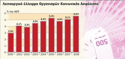 Ειδικότερα, παρέθεσε στοιχεία σύμφωνα με τα οποία το συνολικό ετήσιο λειτουργικό έλλειμμα των οργανισμών κοινωνικής ασφάλισης, από 3% ως ποσοστό του ΑΕΠ που ήταν το 2000, εφέτος θα διαμορφωθεί στο 5,1% και το 2008 προβλέπεται να φθάσει στο 5,6%. Την ίδια περίοδο (2000-2008) οι συνολικές μεταβιβάσεις του κρατικού προϋπολογισμού προς τα Ταμεία ξεπέρασαν, όπως είπε, τα 90 δισ. ευρώ, όταν το συνολικό πλεόνασμα των Ταμείων φθάνει μόλις στα 29 δισ. ευρώ. Κατά τον υπουργό οι μεταβιβάσεις αυτές, από 6,021 δισ. ευρώ ή 4,8% ως ποσοστό του ΑΕΠ που ήταν το 2000, τον προσεχή χρόνο (2008) υπολογίζεται ότι θα φθάσουν στα 15,155 δισ. ευρώ, που αντιστοιχεί σε 6,8% επί του ΑΕΠ.
